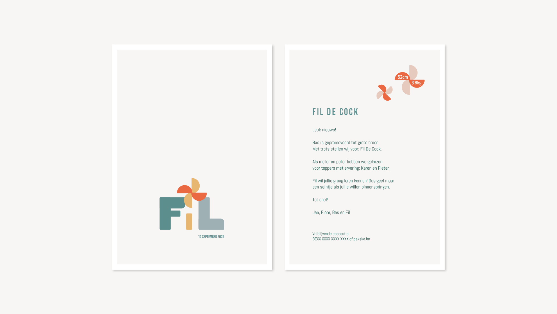 Naast mijn werk voor merken werk ik met evenveel plezier aan gelegenheidsdrukwerk, met geboortekaartjes als favoriet. Elk ontwerp wordt volledig op maat gemaakt, maar binnen een herkenbare stijl waarin ik graag speel met kleur, typografie en compositie.