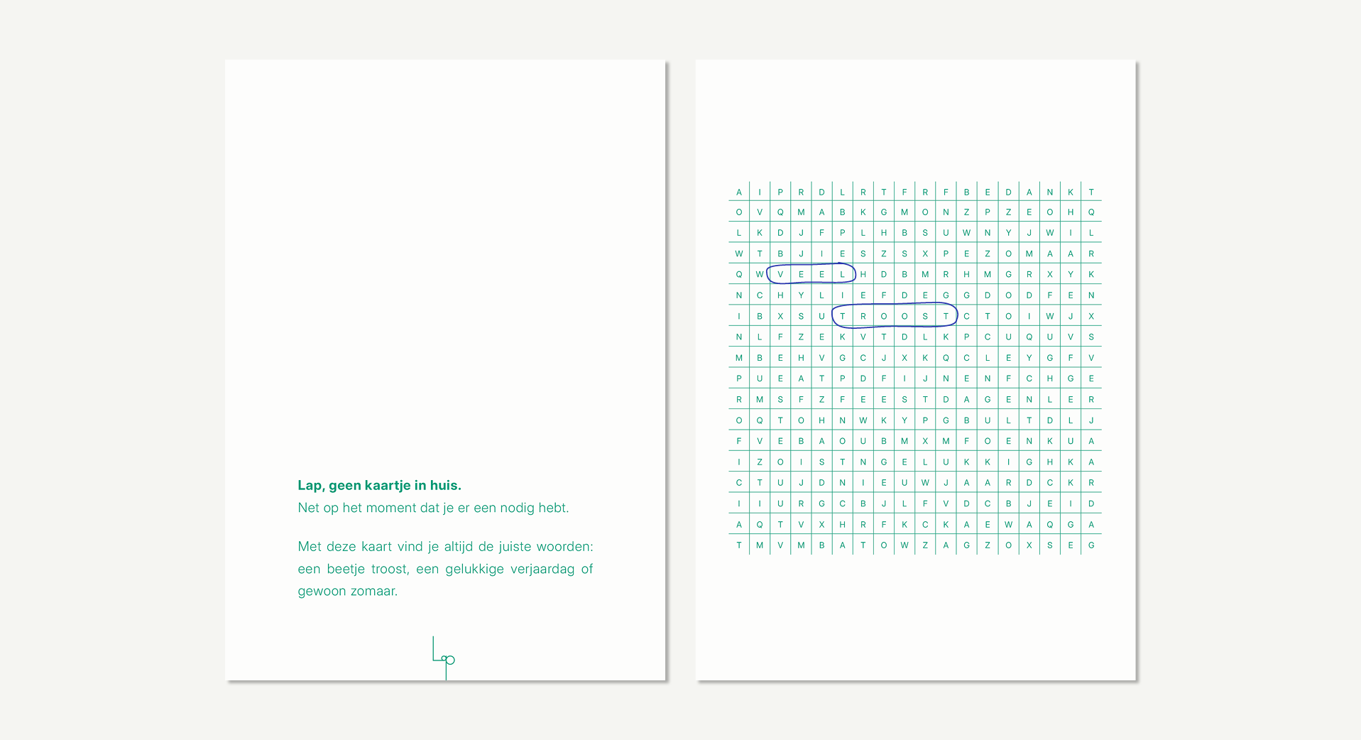 Omdat ik zelf nooit een kaartje in huis had op het moment dat ik er eentje nodig had, ontwierp ik deze woordzoekerkaarten met negen verschillende boodschappen: bedankt, zomaar, veel liefde, veel troost, fijne feestdagen, gelukkige verjaardag, gelukkig nieuwjaar, feest en proficiat.
